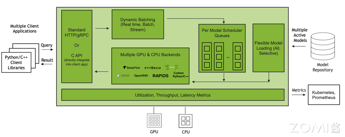 Triton Inference Server是性能优先的框架,英伟达官方优化,适合 GPU 推理的高性能场景。其核心优势是多硬件/多引擎兼容+低延迟调度——支持 GPU、CPU、NPU 等硬件,可调用 TensorRT、vLLM、SGLang 等引擎;内置动态 Batching、模型并行、优先级调度等功能,在 H100 上运行 70B 模型时,吞吐比 KServe 高 30%,P99 延迟低 20%。此外,Triton 的模型仓库功能支持从 S3、GCS 等对象存储加载模型,无需本地存储,适配云端分布式部署。但 Triton 的云原生能力较弱,更适合聚焦性能、以 GPU 为主的推理场景。