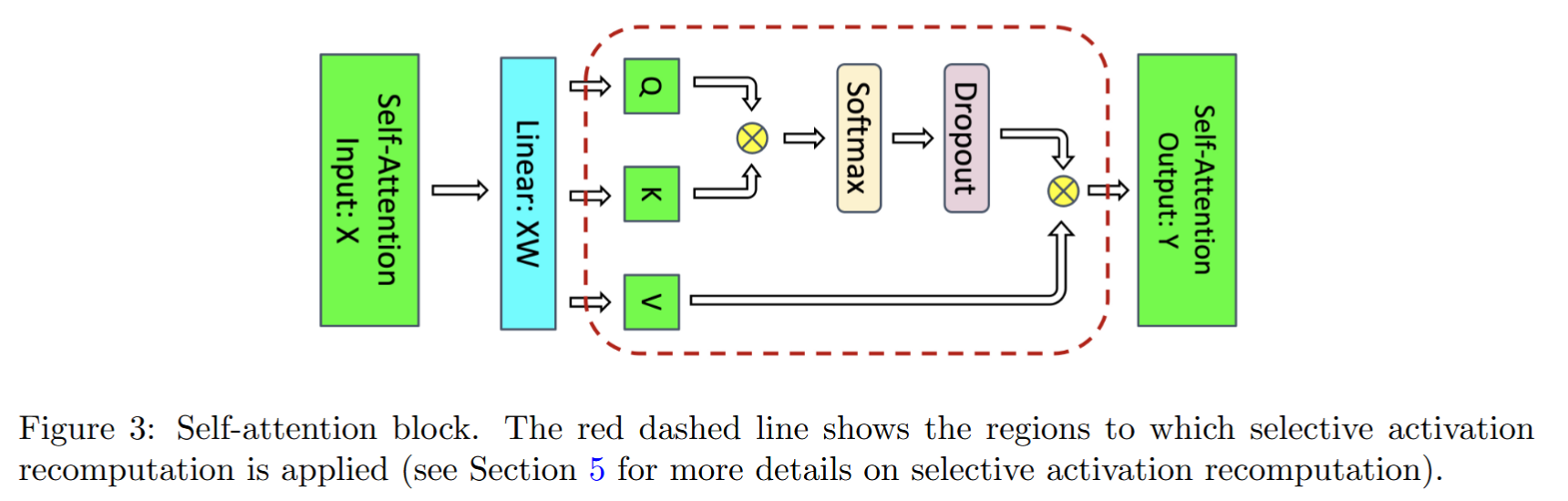 下图中紫色图标标识出了需要存储的激活张量(不考虑 Embedding 层,并忽略 LayerNorm 的均值与方差所占的约 \(2bs\) 字节):