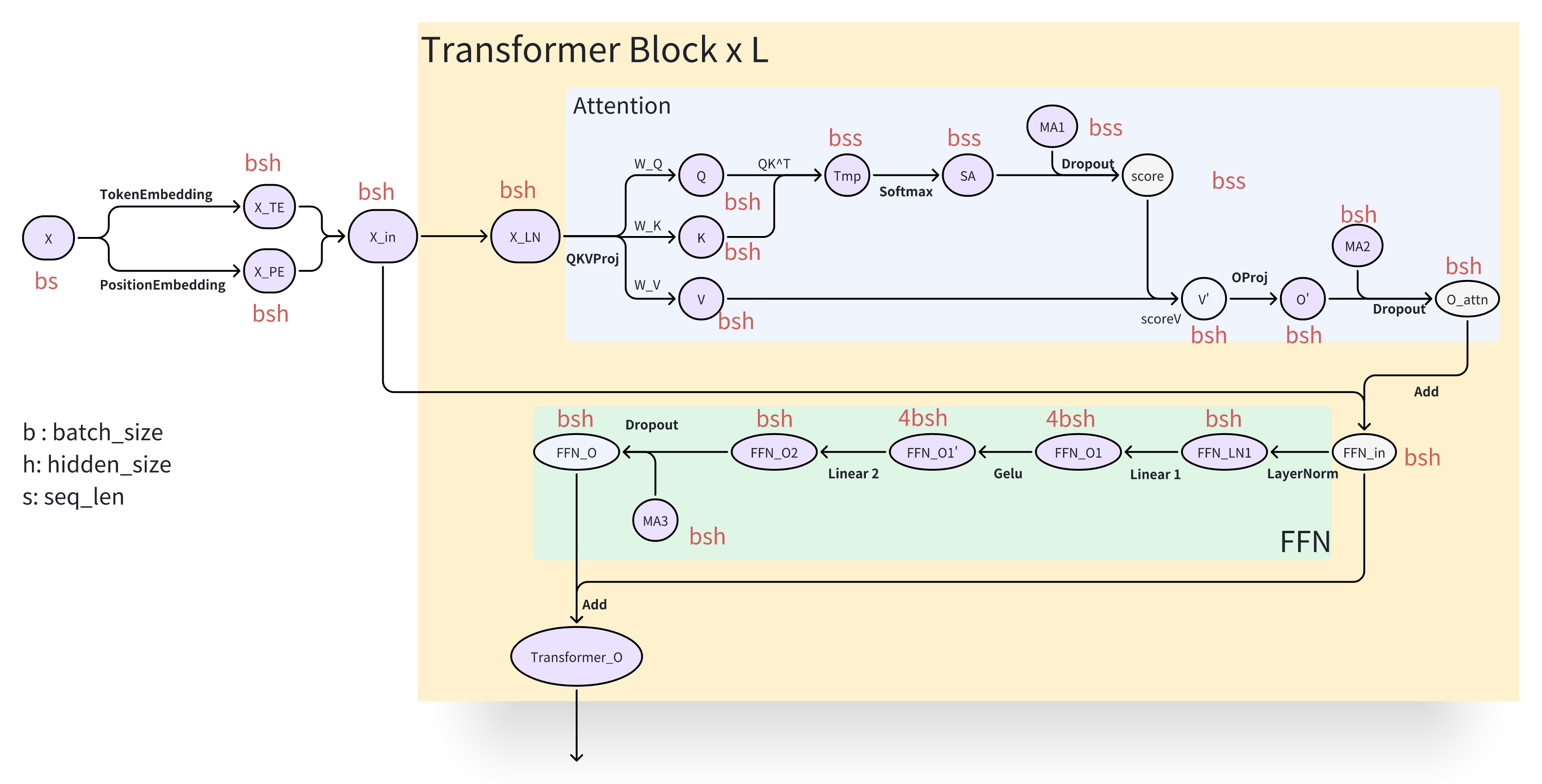 以标准 Transformer 层为例,对其需要保存的激活值进行分析如下: