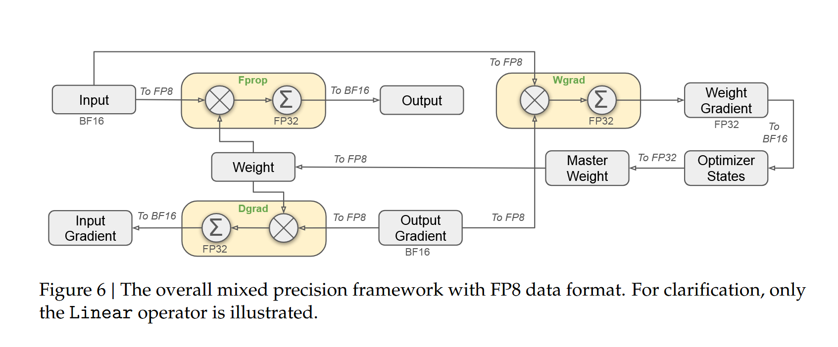 DeepSeek-V3(671B参数)采用了先进的FP8混合精度训练方案,体现了该技术在前沿模型中的实际应用。其训练配置采用多层次精度策略:前向传播使用FP8 E4M3格式处理权重和激活值,反向传播使用FP8 E5M2格式进行梯度计算,优化器状态使用FP32维护Adam状态,主参数副本则使用BF16格式以平衡精度和显存需求。