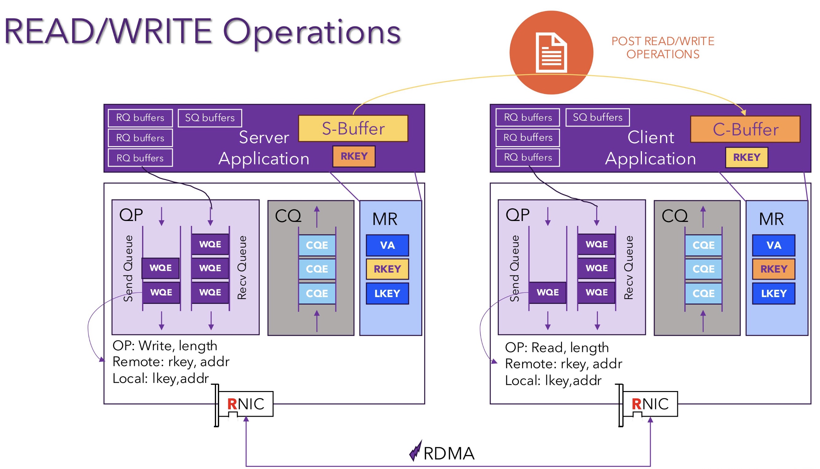 完成通知:操作完成后,RNIC 将一个完成项(WC)放入 CQ。应用程序通过轮询 CQ 来检查操作是否成功完成,并进行后续处理。
