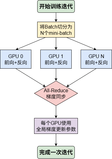 数据并行是最为经典且广泛应用的并行策略,其核心思想可概括为“模型复制,数据分片”,在 Transformer 大模型训练中是提升吞吐率的基础手段。在数据并行模式下,每个参与训练的 GPU 都会保有一份完整的 Transformer 模型副本(包括所有注意力层、前馈网络层的参数)。训练开始时,一个大的数据批次(Batch)会被切分成多个子批次(mini-batch),并分发给不同的 GPU。每个 GPU 独立对自己分到的数据进行前向传播(计算 Transformer 各层的激活值与损失)、反向传播(计算各层参数的梯度),至此完成对模型参数的“修改意见”计算。
