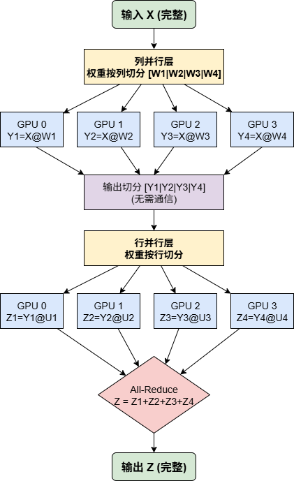 行并行:将权重矩阵 \(A\) 按行切分(\(A = [A_1; A_2; ...]\)),同时将输入 \(X\) 按列切分(\(X = [X_1, X_2, ...]\)),每个 GPU 计算 \(Y_i = X_iA_i\),最终通过 All-Reduce 聚合得到完整输出 \(Y = Y_1 + Y_2 + ...\)。