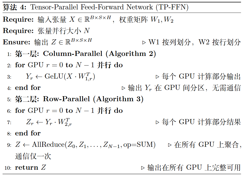 算法 4:Transformer 前馈网络的张量并行实现