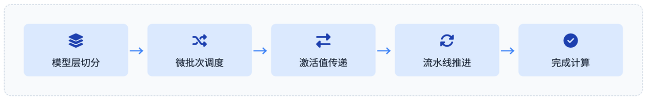 一个微批次完成某阶段前向计算后,立即送入下一阶段,无需等待全批次;