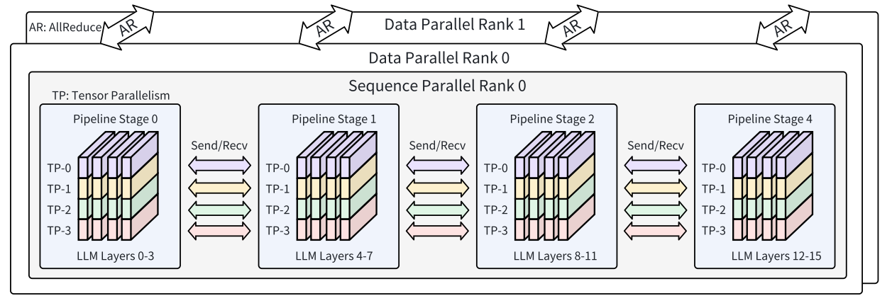 图 5:Transformer 大模型 4D 并行(DP+PP+TP+SP)架构示例