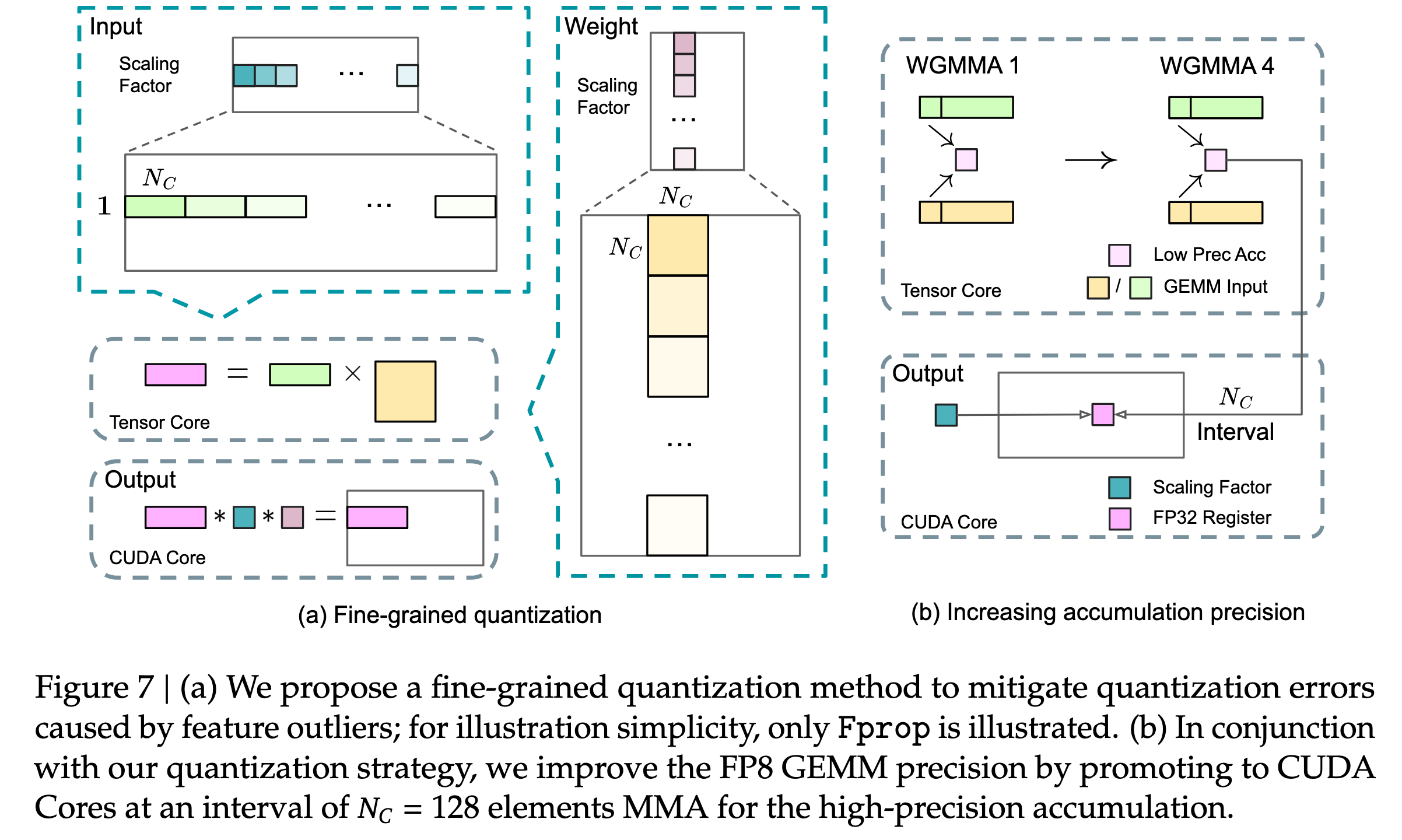 1x128作为一个 Group / 权重以128x128作为一个 Group 进行分块并缩放,每个分块对应一个 Scaling Factor (FP32) 作为缩放因子。两级累加:对于计算中切分出的每个 Tile,首先在 Tensor Core 中使用