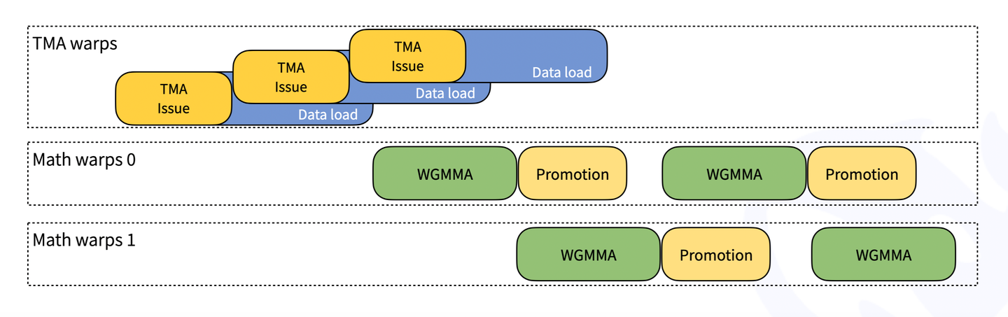 DeepGEMM 获取高性能的关键在于其充分利用了 NVIDIA Hopper 架构的新特性,其核心思想是 Warp Specialization (WS,线程束专门化) 和异步计算访存流水线。