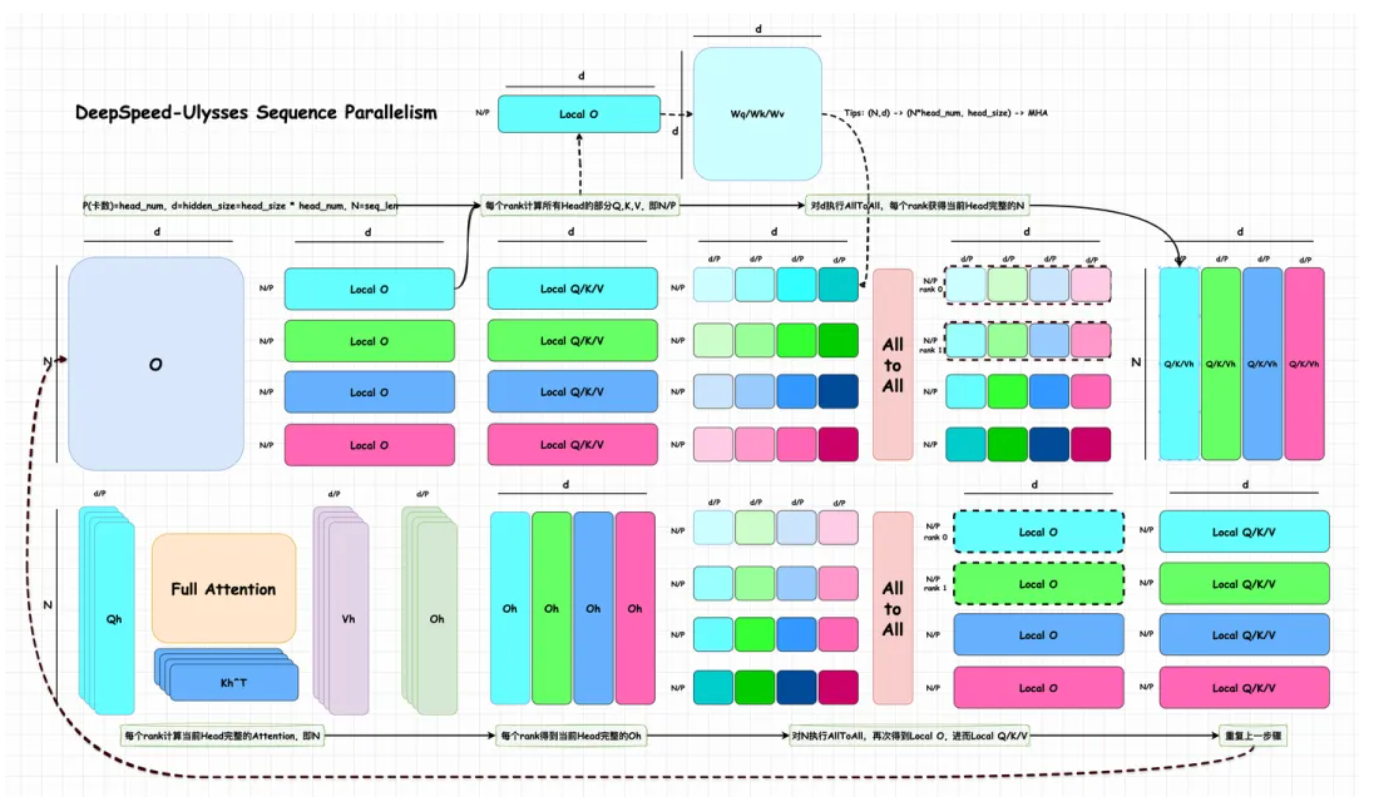 传统的 Megatron-LM 序列并行方案通过 AllGather 等通信完成这一过程,但其通信复杂度较高,扩展性有限。DeepSpeed-Ulysses 的核心贡献就是降低序列并行的通信量,从而支持更长的序列。