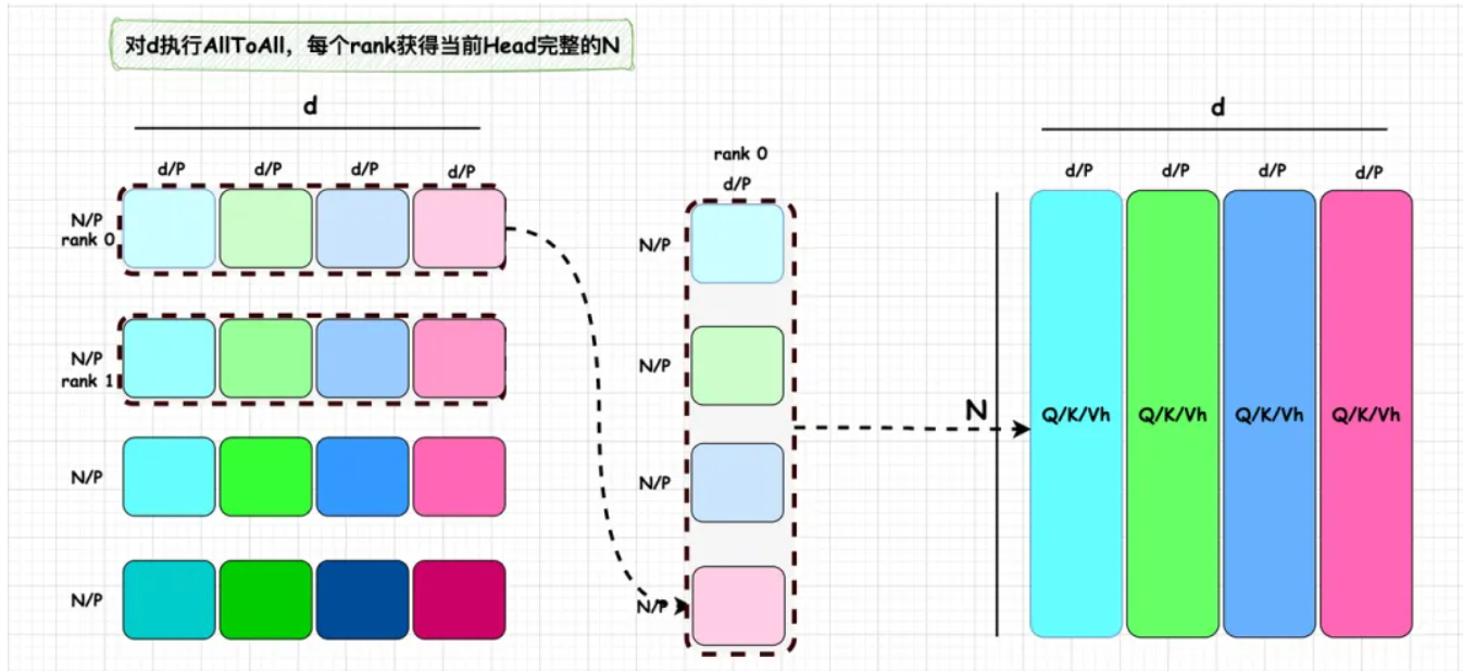 第一次 All-to-All(对 d 维度): 经过上一个步骤,我们得到的 Local Q/K/V,每个卡只有持有其中 N/P 部分,但是 Attention 部分要求对完整的 N 进行注意力机制的计算,并且,最好同时能实现 Attention 的分布式运算。为此,我们需要使得每卡恰好持有一个 Attention Head 的 N 维度上完整的 Q/K/V 值。这要怎么实现呢?DeepSpeed 团队发现,此时,只要对 d 维度执行一个 All-To-All 操作,恰好能实现这个功能。