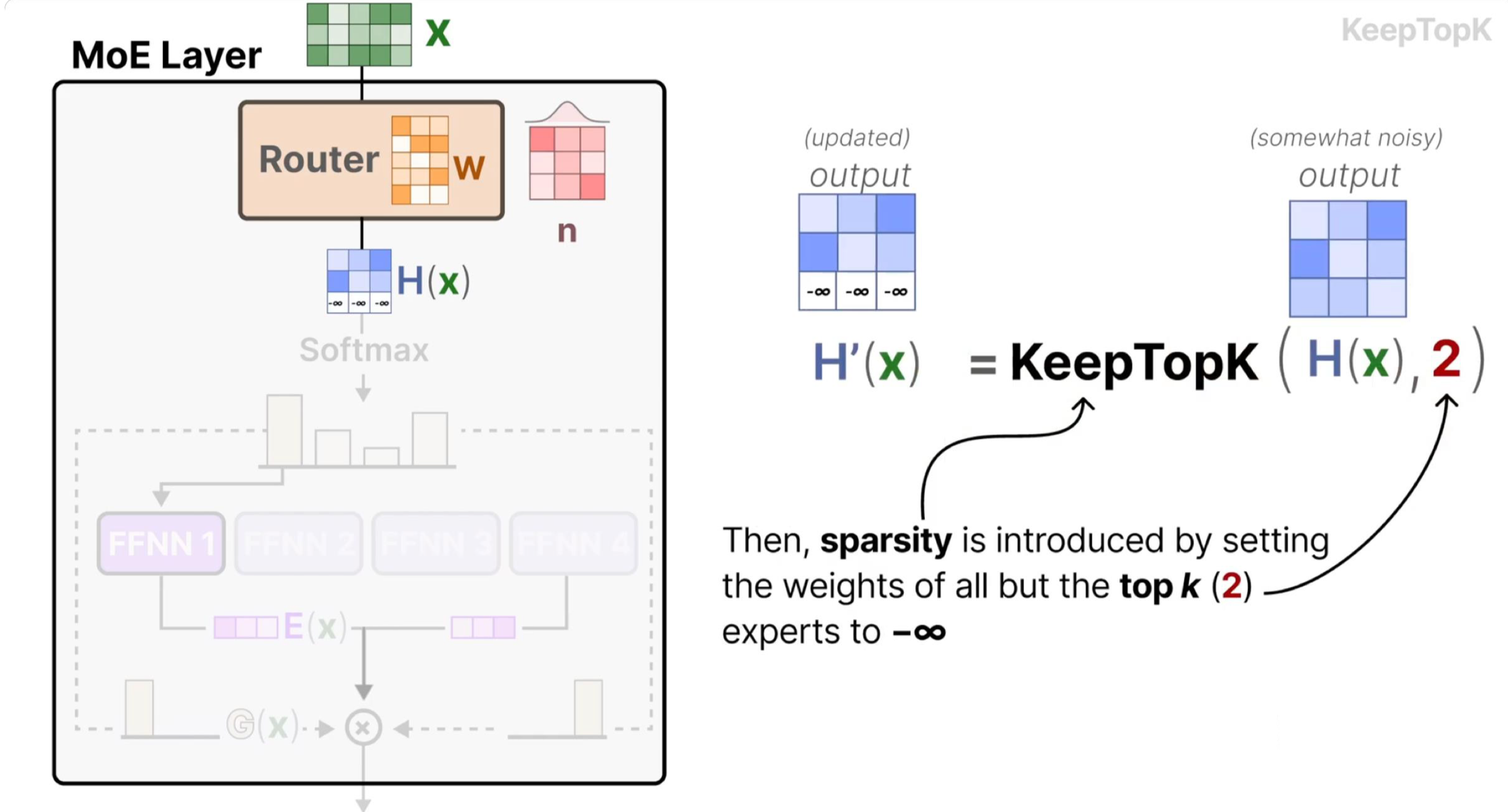 具体来说,我们通过将除了 TopK 专家的权重设置成负无穷,之后再经过 softmax,没有被选中的专家的权重就约等于 0。