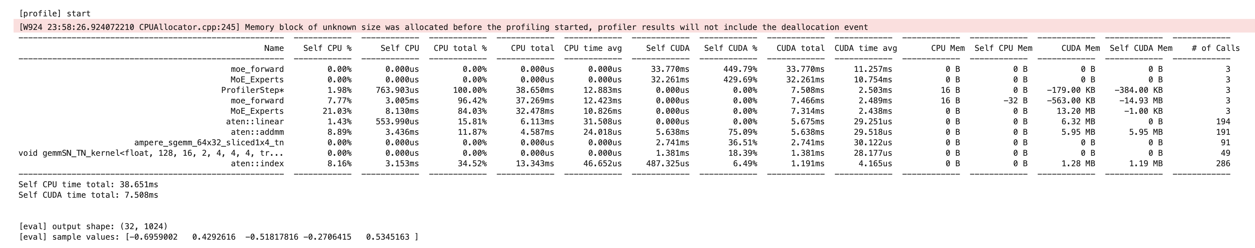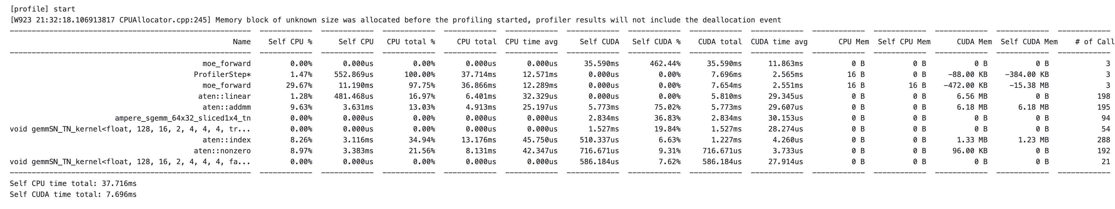 MoE_Experts 21.03% 8.130ms 84.03% 32.478ms 10.826ms 0.000us 0.00% 7.314ms 2.438ms 0 B 0 B 13.20 MB -1.00 KB 3