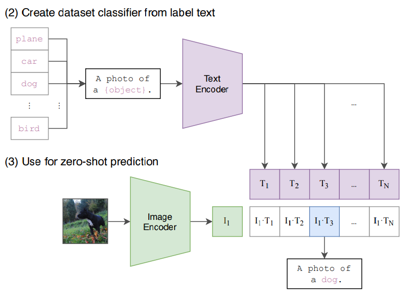 尽管如此,CLIP 只能获取到视觉和文本上的特征,但是并没有在分类的任务上做训练或者微调,所以是没有分类头的。那么没有分类如何做推理呢?作者于是想到了 prompt template。