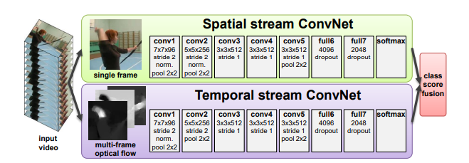 双流网络作者把视频分为空间部分和时间部分,空间部分描述视频中的场景和物体信息,时间部分描述视频中的物体是如何运动的,根据这种拆分,作者提出了下图的双流网络框架。