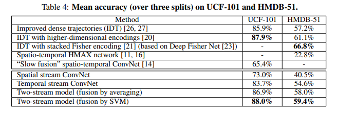 在 UCF-101 上已经追平了手工最好的方法,HMDB-5L 是一个当时也较为流行的任务很难的数据集,也已经很接近最高最平,最重要的是远远超过了之前神经网络做视频理解的方法。