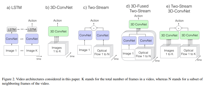 提出了新的数据集:I3D 作者认为图像处理任务在当时发展那么好有个很重要的原因是 ImageNet 这个足够大的数据集给视觉研究者们提供各种特征做预训练,但视频领域当时并没有与 Imagenet 匹配的足够优秀的视频大规模数据集,因此提出了新的视频分类数据集 Kinetics,该数据集优点有: