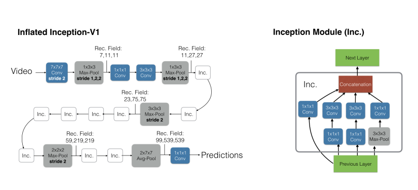 左侧是 Inflated Inception-V1 结构,就是卷积核都加了一个维度(