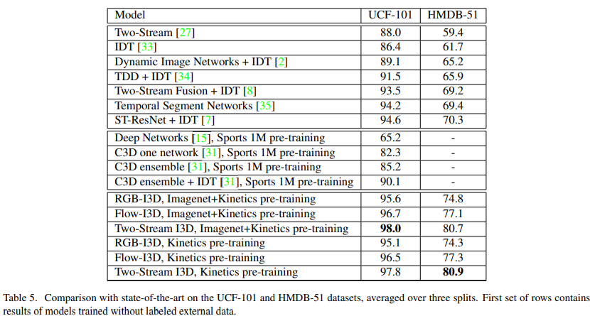 如果没有好的训练数据,可以使用 ImageNet 上预训练的模型按本文的方式扩张到 3D 网络,这样不用设计 3D 网络结构,而且使用了预训练模型的参数进行初始化,效果一般都很好(Inflating+Bootstrapping);