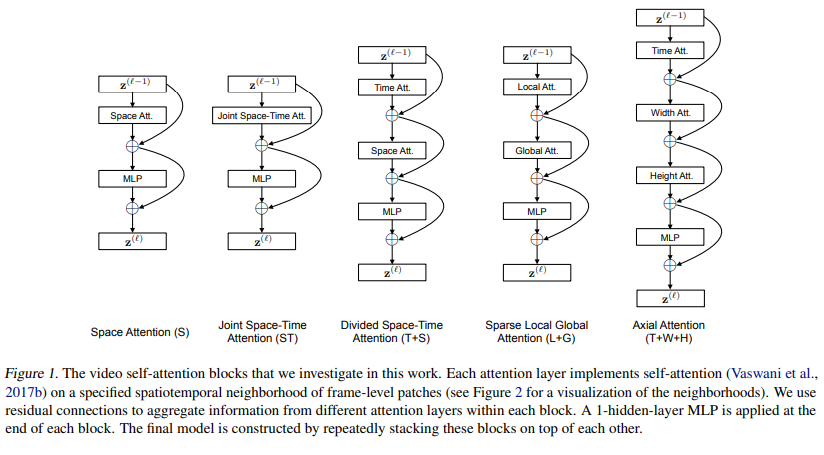 空间注意力机制(S):只在单帧图像上计算空间自注意力+残差连接,然后接一个 MLP+残差连接得到最后的结果,就类似 ViT 本身的做法,相当于一个 baseline。