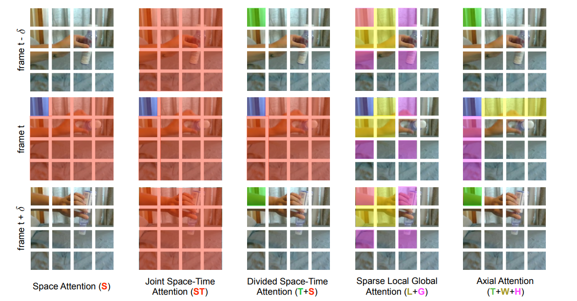 空间注意力机制(S):上图以第 t 帧 blue patch 为基准点时,Space Attention 只计算这一帧内其他 patches 和基准点的 self attention,而完全看不到其它帧的信息。
