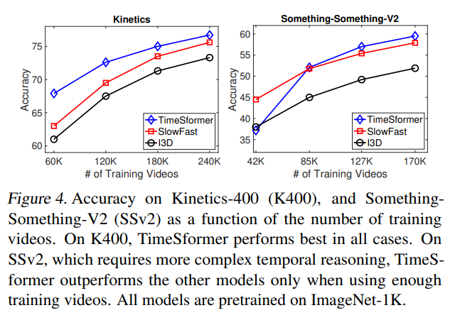 为了研究数据集的规模的影响,使用了两个数据集,实验中,分四组,分别使用 25%,50%,75%和 100%的数据。结果是 TimeSformer 当数据比较少的时候表现不太好,数据多的时候表现好(这个结论和 ViT 中是一样的,即训练 transformer 需要更大的数据量才能达到媲美 CNN 的效果)。