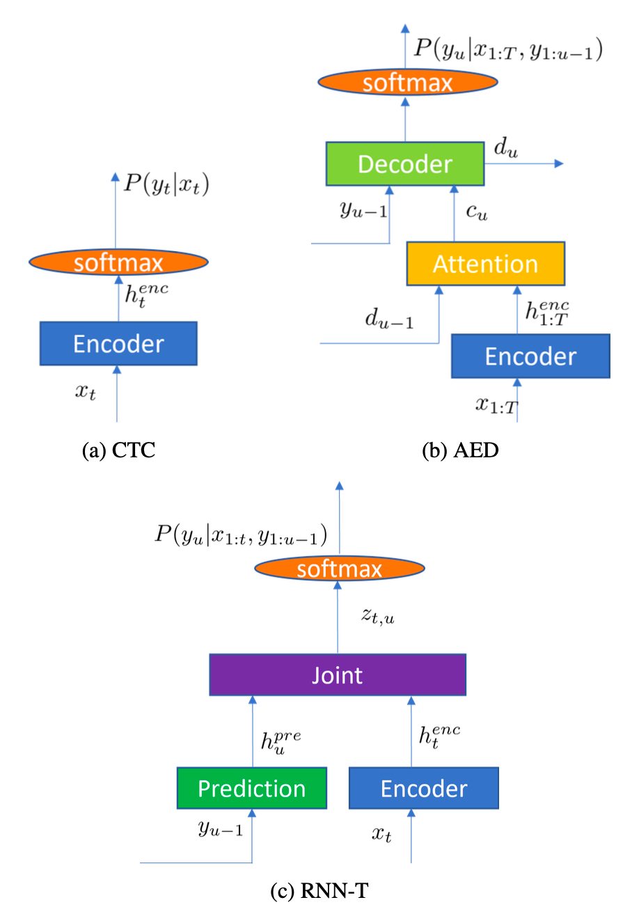 循环神经网络变换器(RNN-T):RNN-T 是目前工业界最主流的 E2E 模型,尤其适用于流式识别。它包含编码器(encoder)、预测网络(Predictor)、联合网络(Jointer):编码器将当前语音进行声学编码;预测网络把输出的历史文本编码;联合网络把声学编码和文本历史编码合并进行下一个字的预测。其关键优势在于,输出不仅依赖于当前的音频输入,还依赖于已生成的文本历史,这使得它天然支持因果推断和低延迟处理。